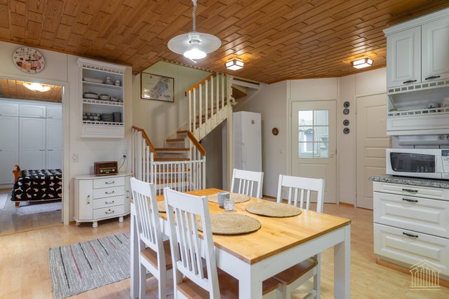 Talon pohjaratkaisu on käytännöllinen ja tilat on suunniteltu arjen sujuvuutta ajatellen. Alakertaan avautuu avara olohuoneen ja ruokailutilan muodostama oleskelutila, jossa tunnelmaa tuo varaava takka. Tila yhdistyy saumattomasti keittiöön, jossa on panostettu työskentelytilaan. Keittiön viimeistelee puuhella. Alakerrassa on lisäksi tilava makuuhuone ja arkea helpottava kodinhoitohuone, josta on myös käynti kylpyhuoneen kautta ulos. Katettu lasitettu kuisti tarjoaa mukavan vilvoittelupaikan. Kokonaisuuden täydentää puukiukaalla varustettu sauna.