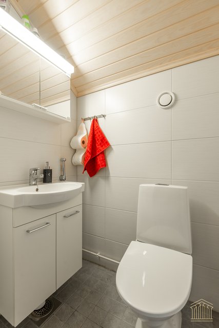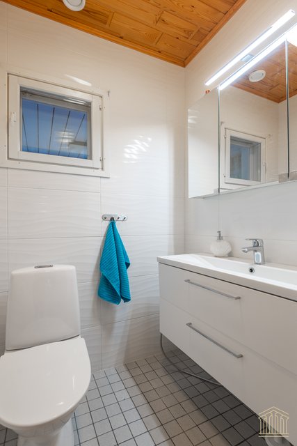 - Alakerta: Varusteet: wc-istuin, allaskaappi, allas, peilikaappi, ikkuna, lattialämmitys (vesikiertoinen) Lattiamateriaali: laatta Seinämateriaali: kaakeli Yläkerta: Varusteet: wc-istuin, allaskaappi, allas, peilikaappi, lattialämmitys (sähköinen) Lattiamateriaali: laatta Seinämateriaali: kaakeli