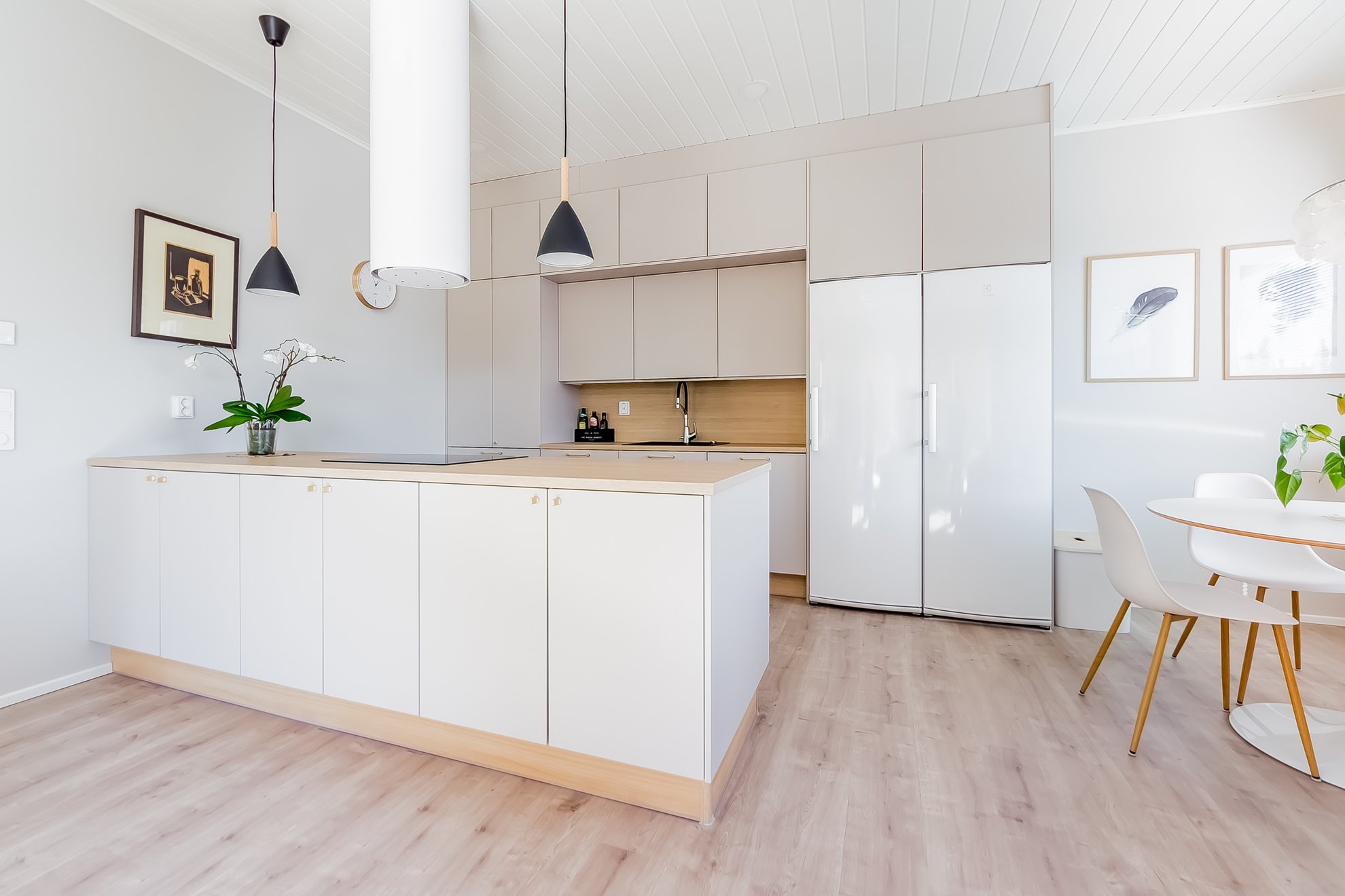 - Kauniit, linjakkaat kalusteet ja laadukas kodinkoneistus. Saareke erottaa keittiön olohuoneesta. Ns. aamiaiskaappi.