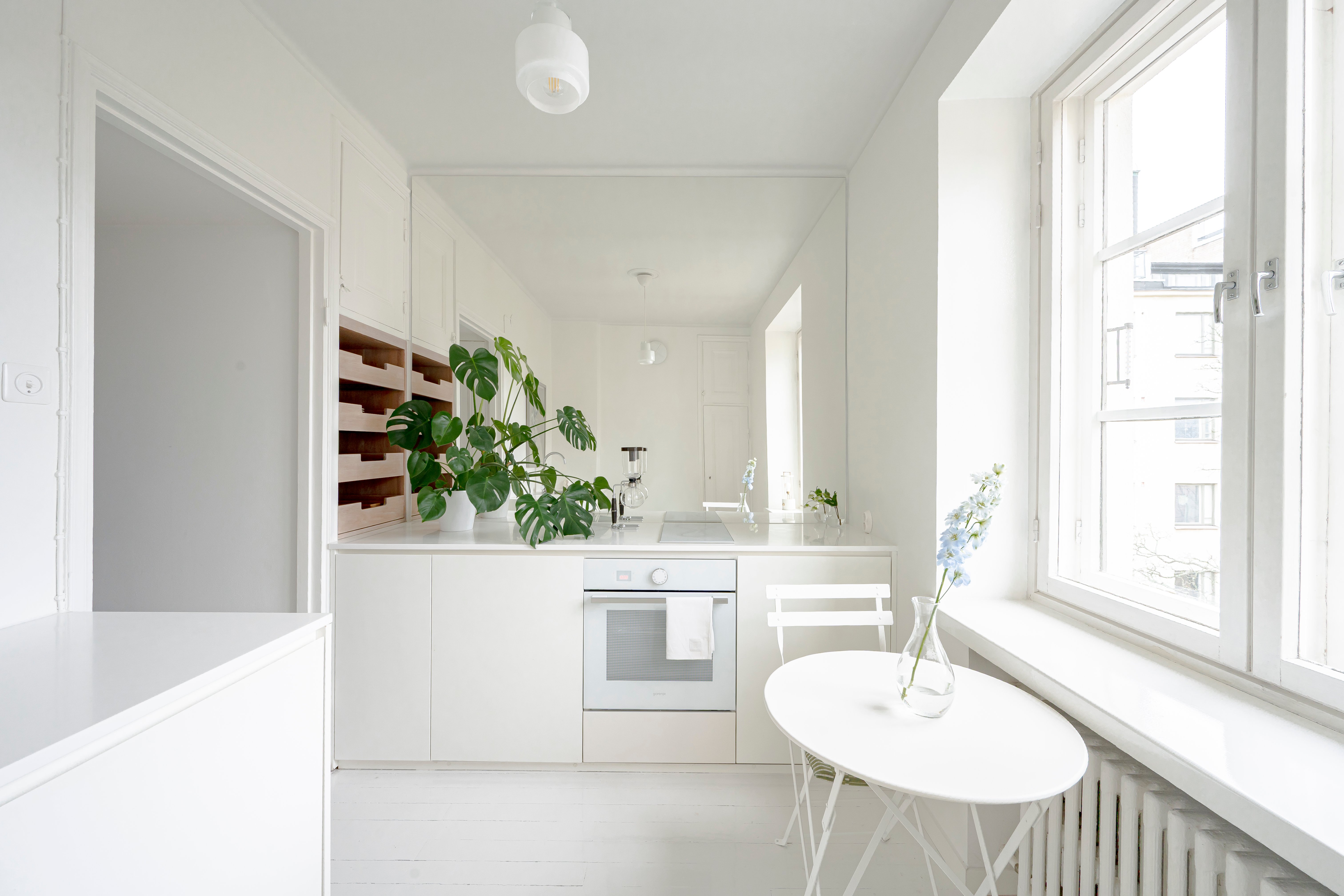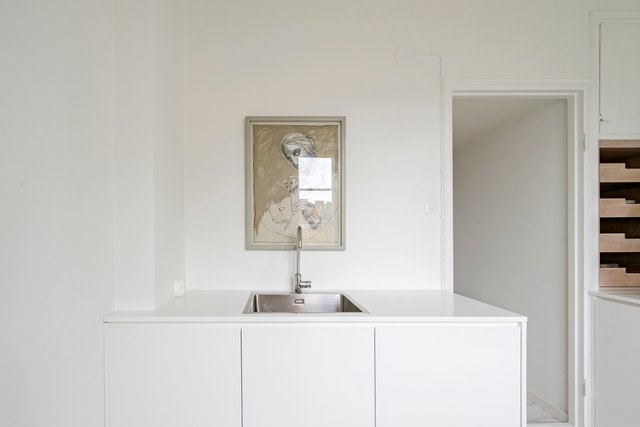 - Keittiössä on suuri ikkuna, josta avautuvat kauniit näkymät rauhalliselle sisäpihalle. Varusteluun kuuluvat laadukkaat kodinkoneet: jääkaappi ja pakastin (Smeg), induktioliesitaso, uuni (Gorenje) sekä astianpesukone (Smeg). Yhdellä keittiön seinistä on suuri peili, joka tuo tilaan valoa ja avaruutta. Säilytystilaa on runsaasti kaapistojen, vetolaatikostojen ja alkuperäisen komeron ansiosta. Lattiana on tunnelmallinen, maalattu lautalattia. Keittö on teetetty mittatilaustyönä.
