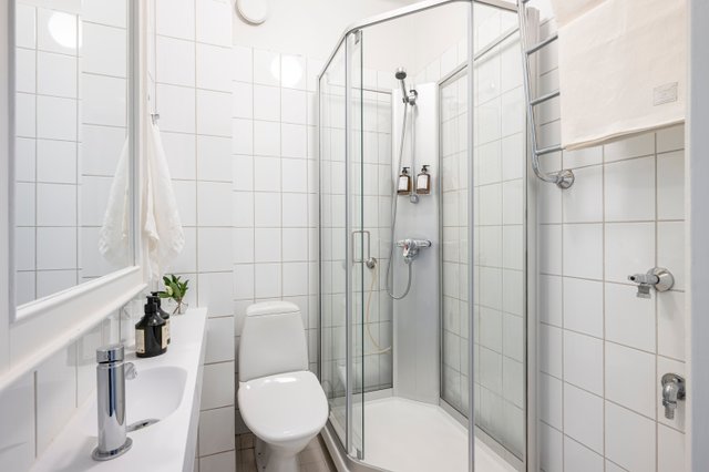 Kylpyhuone on siisti ja käytännöllinen kokonaisuus, jossa on kaikki tarpeellinen mukavaan asumiseen. Asunto sopii erinomaisesti niin kaupunkikodiksi, pied-à-terreksi kuin laadukkaaksi sijoituskohteeksikin.