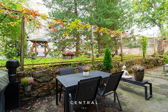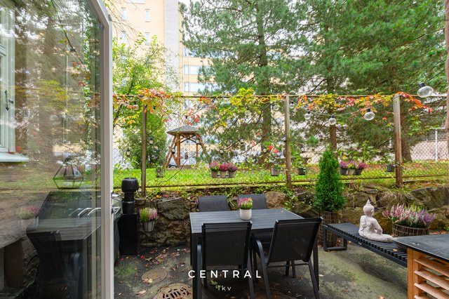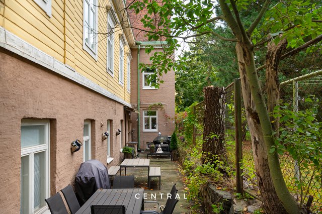 Denna bostad är i tre etager, där det i bottenvåningen finns en fin bastuavdelning. Från mellanvåningens gavel kommer man ut till husbolagets trivsamma gård, där en del blivit till en naturlig del av denna bostad. Två badrum och två toaletter, rymligt klädrum och hemvårdsutrymme.