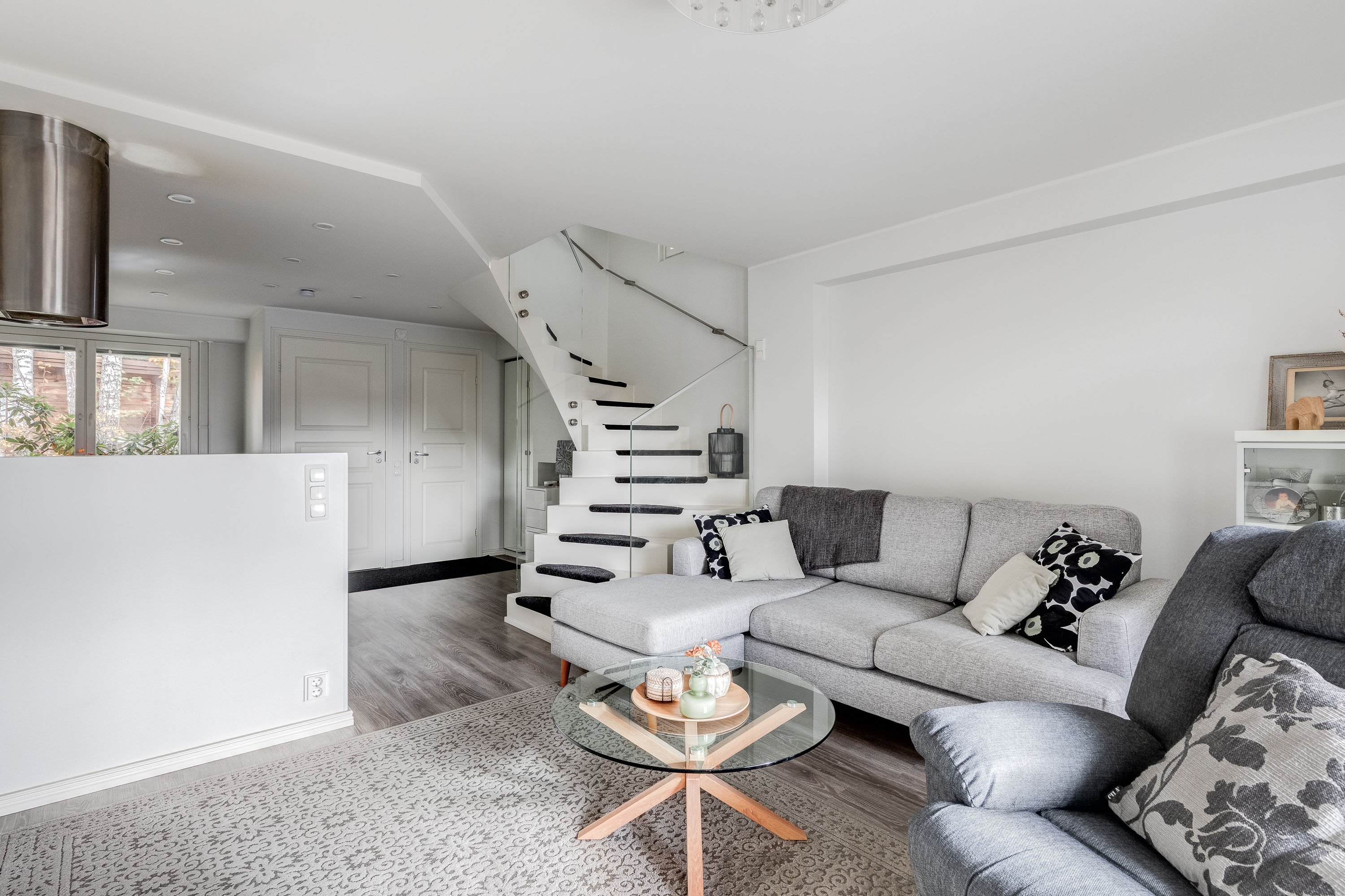 Kodin alakerrasta löytyvät oleskelutilat ja toimiva avokeittiö, jossa on hyvin tilaa ruokapöydälle ja nautit ruokailusta rauhallisissa maisemissa. Olohuoneesta on käynti suoraan etelän puoleiselle aurinkoiselle terassille, missä pääset kesällä paistattelemaan päivää tarvittaessa myös ison markiisin alla. Makuuhuoneet, kylpyhuone ja sauna sijaitsevat yläkerrassa. Molemmista kerroksista löytyy myös ilmalämpöpumput lämmittämään ja viilentämään kotia.
