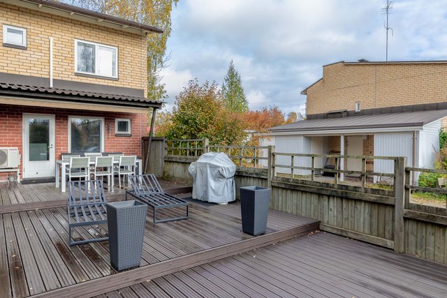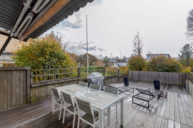 - Terassi on kokonaan laudoitettu, jolloin se on erittäin helppohoitoinen. Halutessaan laudoitusta voi purkaa. Näin saat pihan nurmelle/laatalle ja mahdollisuuden laittaa istutuksia. Terassilla on markiisi, mikä suojaa tarvittaessa pihan etuosan auringolta ja sateelta.