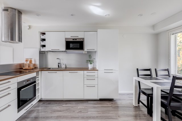 - Jääkaappi, erillinen pakastin, erillisuuni, liesi, liesituuletin, astianpesukone, ja mikroaaltouuni