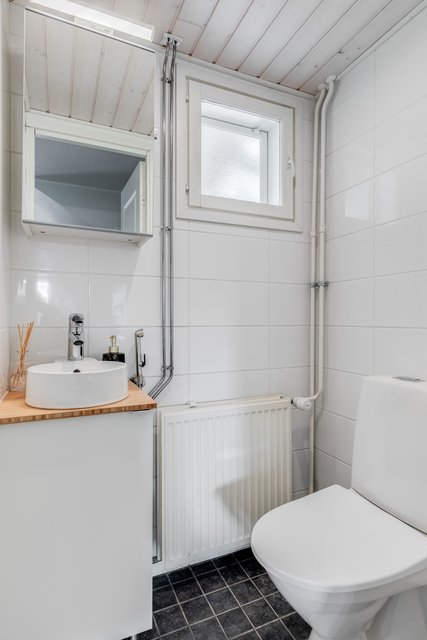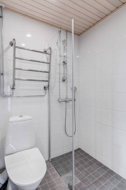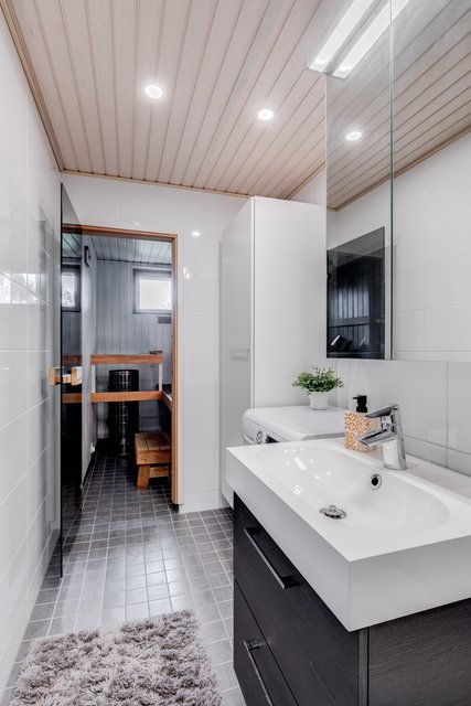 - WC-istuin, suihku, suihkuseinä, pesukoneliitäntä, peilikaappi, allaskaappi, ja bidee-suihku