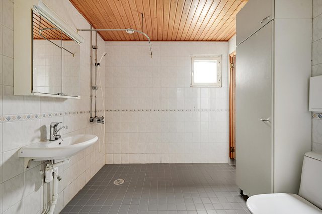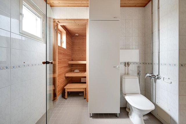 - Pesutilojen yhteydessä sauna ja toinen wc. Pesutiloissa tuuletusikkuna tuomassa luonnonvaloa. Pesuhuoneen lattiassa havainto kopoista laatoista. Taloyhtiö korjaa huoneiston kylpyhuoneen vesieristeeseen saakka. Osakas vastaa laatoista ja laattatöistä sekä mahdollisista kalustevaihdoista.