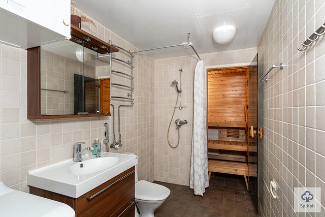 - WC-istuin, suihku, pesukoneliitäntä, peilikaappi, pesuallas, allaskaappi, ja bidee-suihku