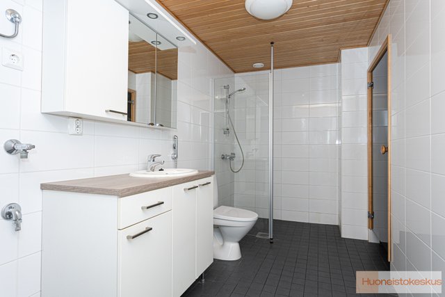 - WC-istuin, suihkuseinä, suihku, pesukoneliitäntä, peilikaappi, ja allaskaappi
