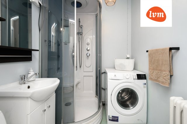 - Suihku, wc-istuin, pesukoneliitäntä, suihkukaappi, pesukone, pesuallas, ja allaskaappi