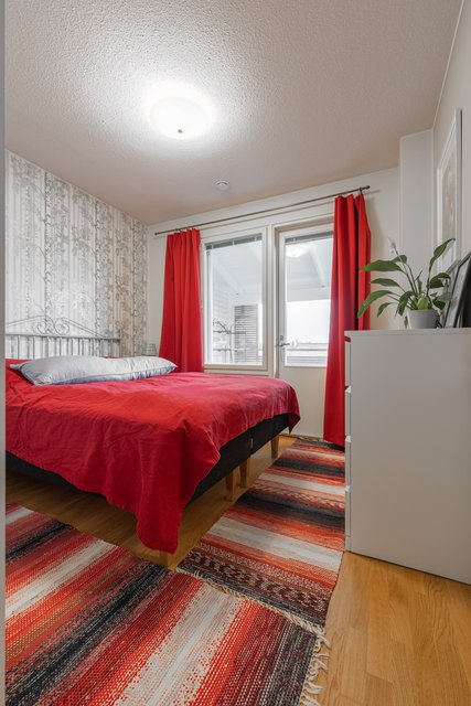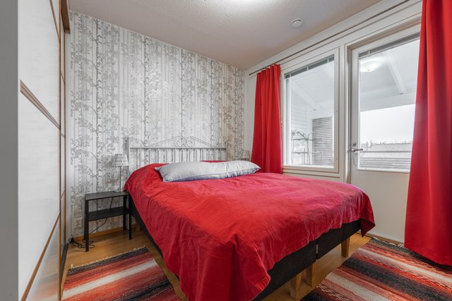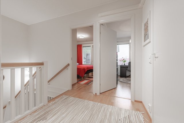 - Makuuhuoneet yläkerrassa, yhdestä huoneesta käynti parvekkeelle, kaikissa huoneissa parkettilattia ja kaapistot, viilentävä ilmalämpöpumppu yläkerran aulassa