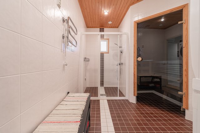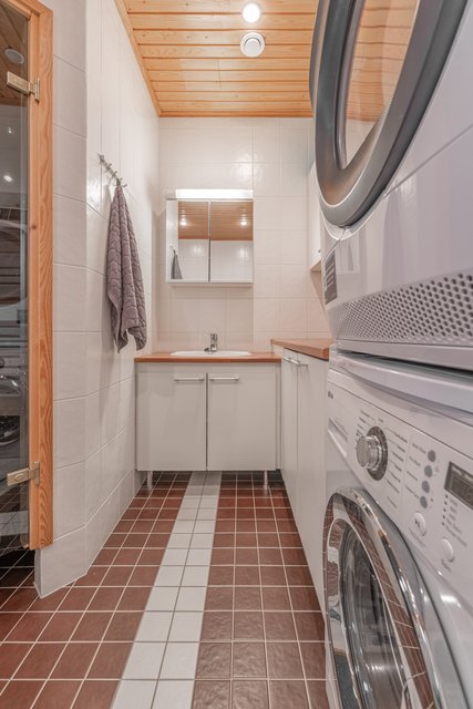 - Suihku, pesukoneliitäntä, lattialämmitys, suihkuseinä, allaskaappi, pesuallas, työtaso, ja peilikaappi