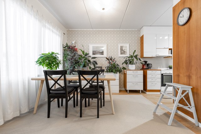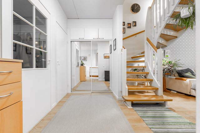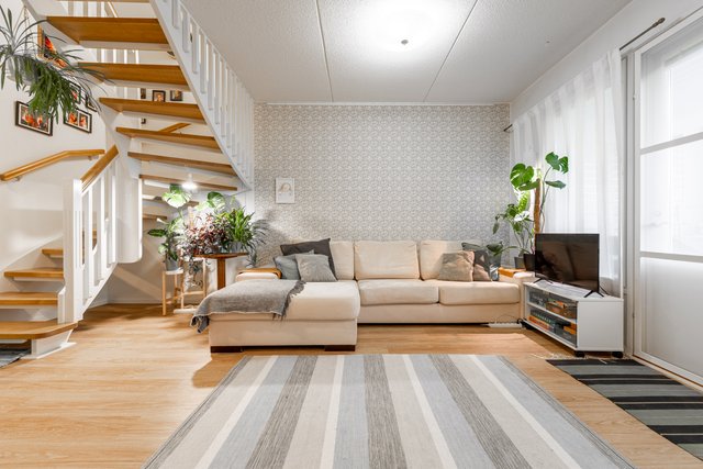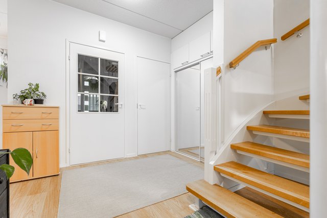 Alakerrassa olohuoneen korkea huonekorkeus ja etelään avautuvat ikkunat tuovat runsaasti luonnonvaloa sisään. Olohuoneesta on käynti omalle terassille ja piha-alueelle. Keittiössä on vaaleat kaapistot ja modernit kodinkoneet, jotka on uusittu vuosina 2021-2023. Erillinen Wc alakerrassa.