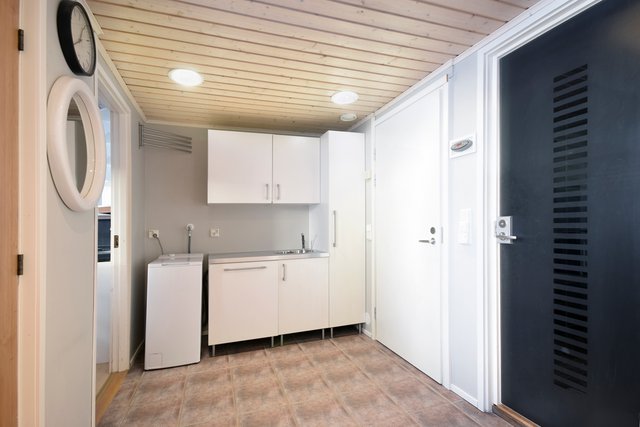 Keittiö on modernisoitu uusilla kaapistoilla, ja sen varusteluun kuuluvat muun muassa erilliset korkea jääkaappi ja korkea pakastin, erillisuuni ja astianpesukone. Kylpyhuone ja sauna on remontoitu vuonna 2008, ja tyylikäs, ikkunallinen saunaosasto tarjoaa rentouttavat löylyt arjen kiireen keskellä. Tilava kodinhoitohuone auttaa arjen kiireen keskellä. Kaksi erillistä wc:tä on käytännöllistä varsinkin lapsiperheissä, ja toisen wc:n marmorilattia tuo ripauksen ylellisyyttä.