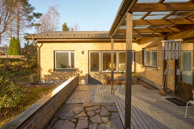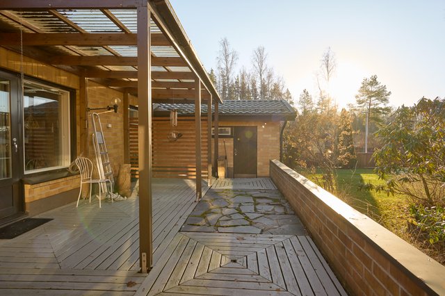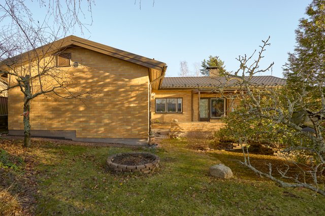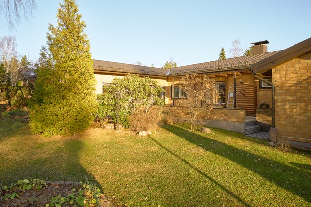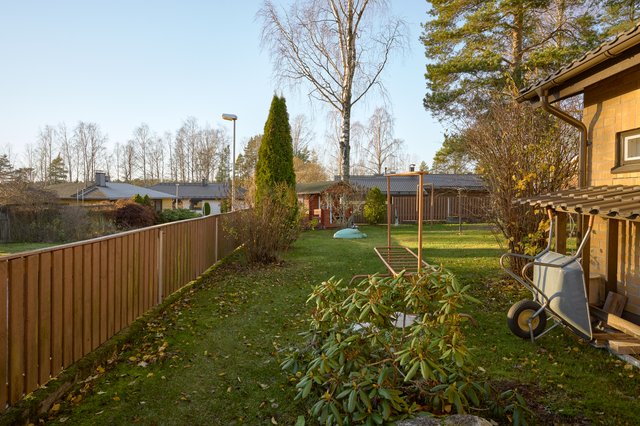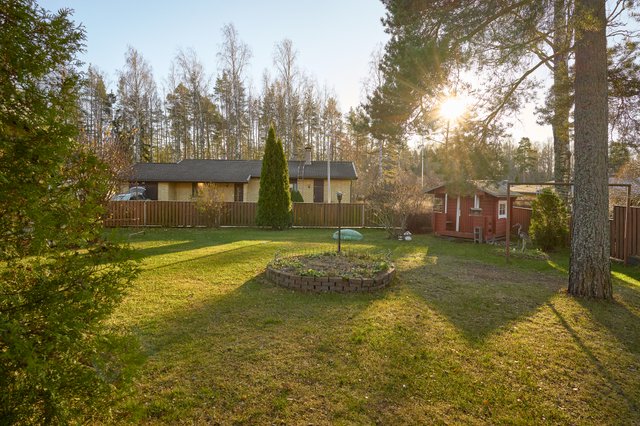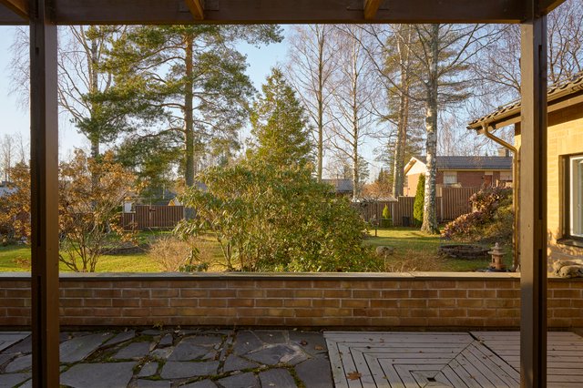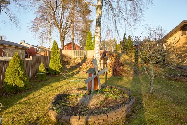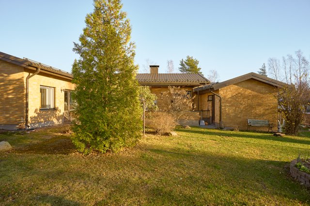 Takapiha on aidattu, siellä on omena- ja kirsikkapuita sekä marjapensaita sekä muita istutuksia. Lisäksi maakellari ja leikkimökki. Tilava terassi takapihalla on ihanteellinen paikka kesäiltojen viettoon.