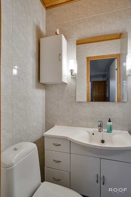 - Suihku, suihkuseinä, pesukone, pesukoneliitäntä, lattialämmitys, ja peili