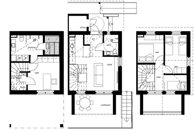 Kodin sydän on avara ja valoisa oleskelutila, jossa keittiö, ruokailutila ja olohuone muodostavat yhtenäisen kokonaisuuden. Suuret ikkunat avautuvat omalle pihalle ja etelään suuntautuvalle lasitetulle terassille, jossa nautit aamukahvista tai illallisesta pitkälle syksyyn. Neljä huonetta ja lähes sata neliötä tarjoavat selkeän ja toimivan pohjaratkaisun, jossa säilytystilat on suunniteltu arkea helpottamaan.