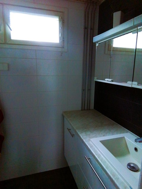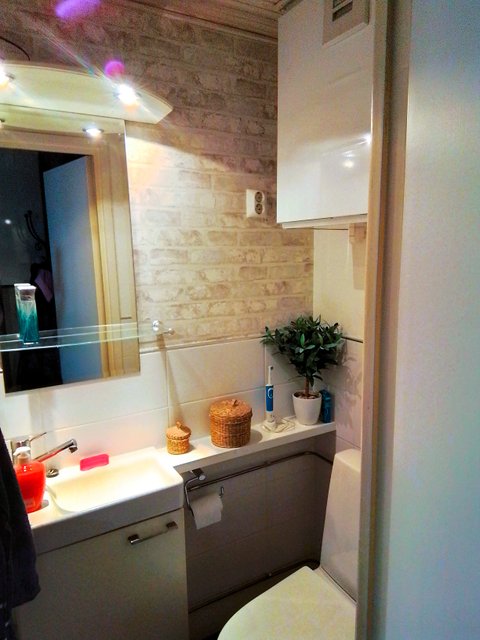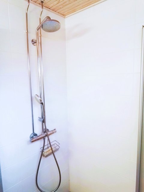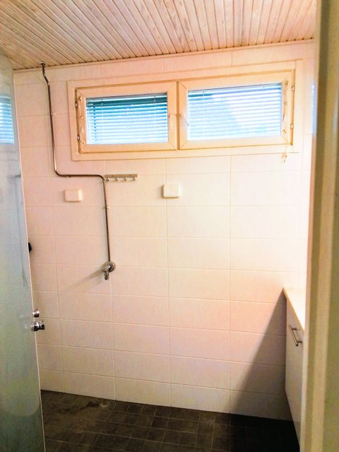 - Suihku, suihkuseinä, pesukoneliitäntä, lattialämmitys, peilikaappi, pesuallas, allaskaappi, ja 2 peilikaappia, 2 suihkuseinää