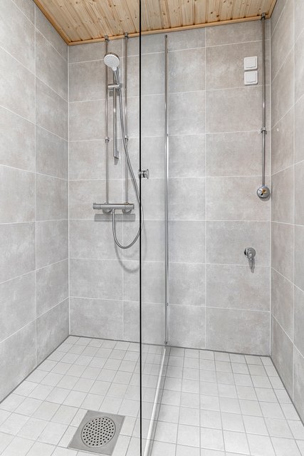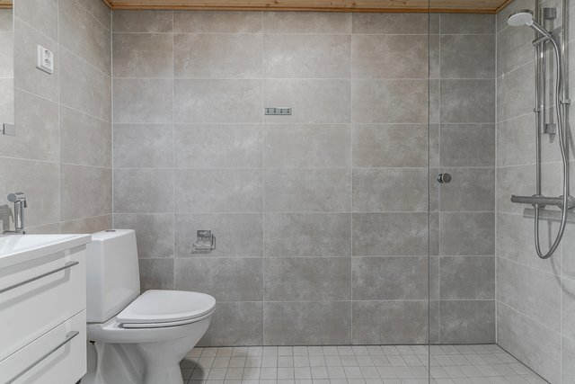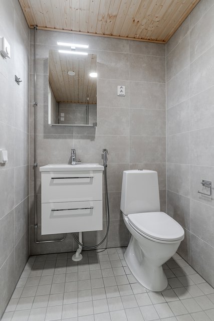 - Suihku, wc-istuin, suihkuseinä, pesukoneliitäntä, lattialämmitys, allaskaappi, ja peilikaappi