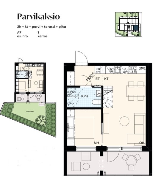2h+avok+parvi+kph+lasitettu parveke 12m2 + piha 25m2