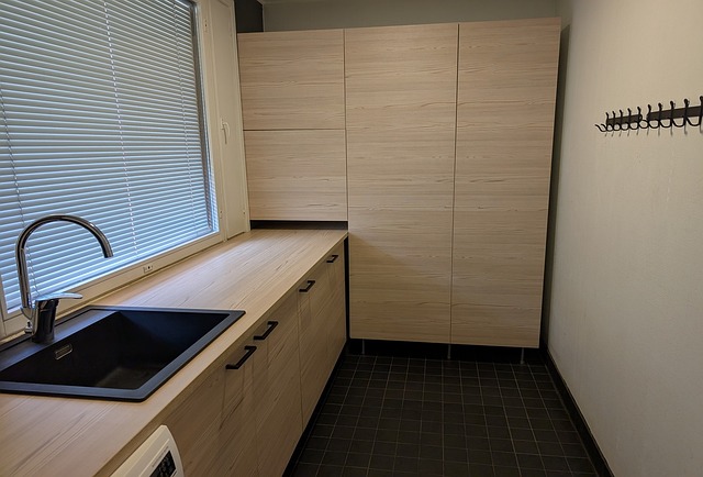 - Lattialämmitys, pesukoneliitäntä, pesukone, pyykkikaapit, ja pöytätaso