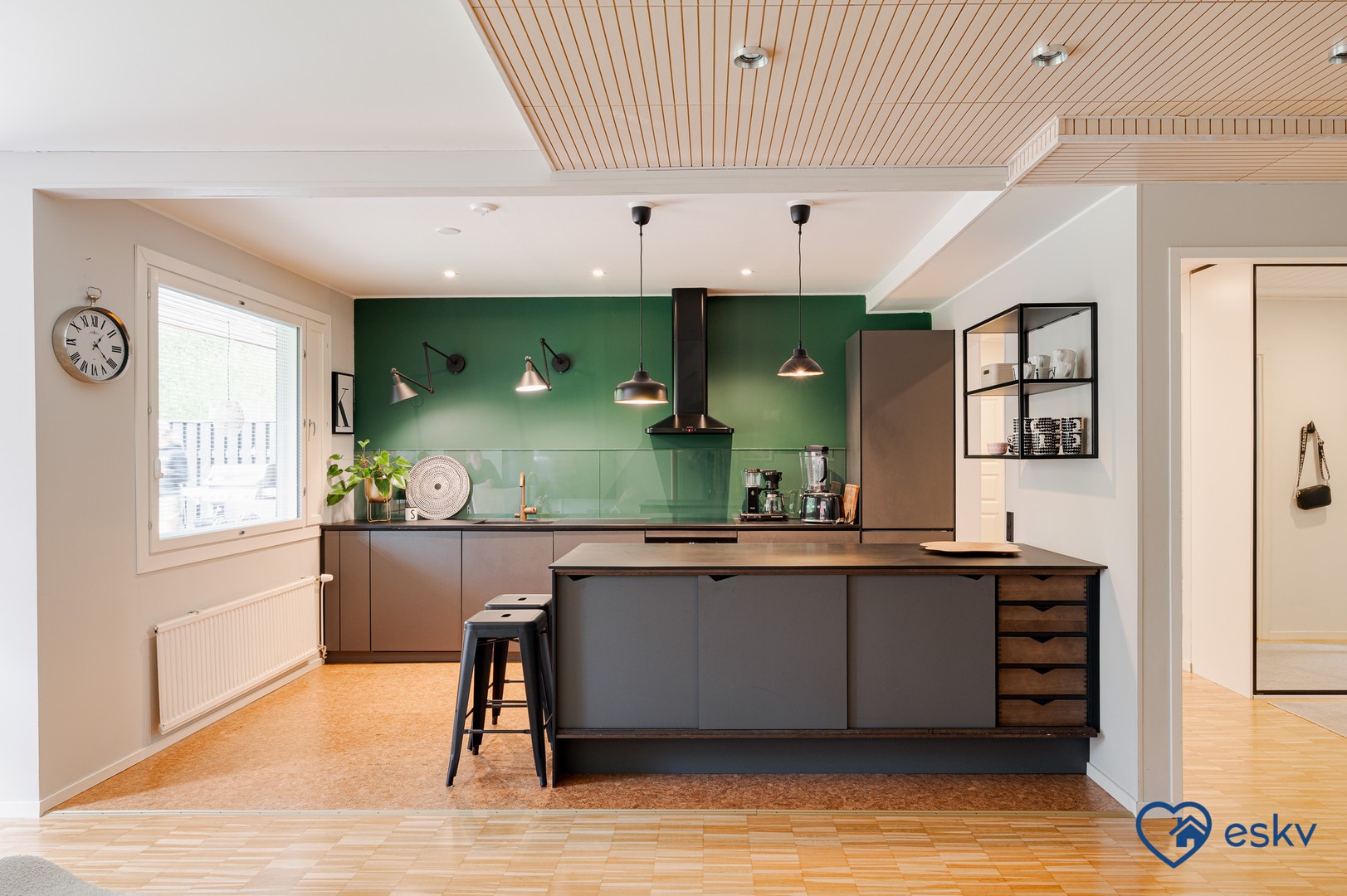 - Moderni avokeittiö yhdistyen olohuoneen ja ruokailutilan kanssa. Keittiö 2019 (Kvik) Varustus: pyrolyysiuuni, induktioliesi, liesituuletin, jääkaappi/pakastin, mikro, astianpesukone (2025), allas ja hana. Keittiön valaisimet. Hyvin kaappi-, ja työskentelytilaa. Lattia korkki, seinät maalattu.