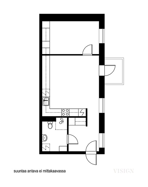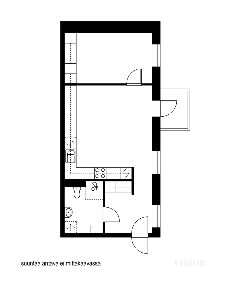Päätyasunto, pienellä ulosvedetyllä parvekkeella.