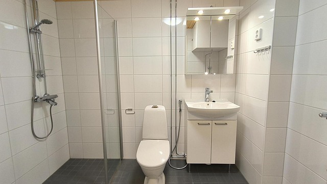 - Suihkuseinä, wc-istuin, ja pesukoneliitäntä
