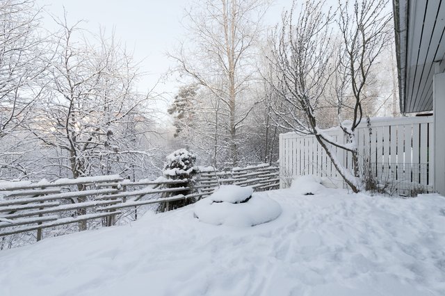 - Osin betonilaatoilla, osin istutettu ja rajattu takapiha. Aidan takana uomassa Korpijoki