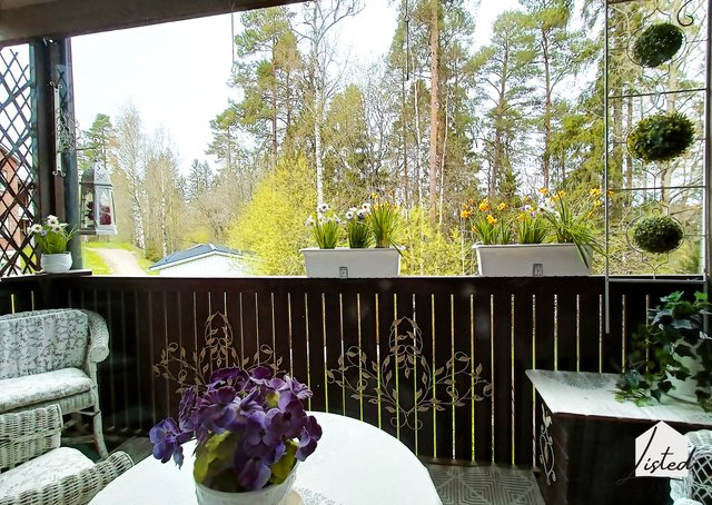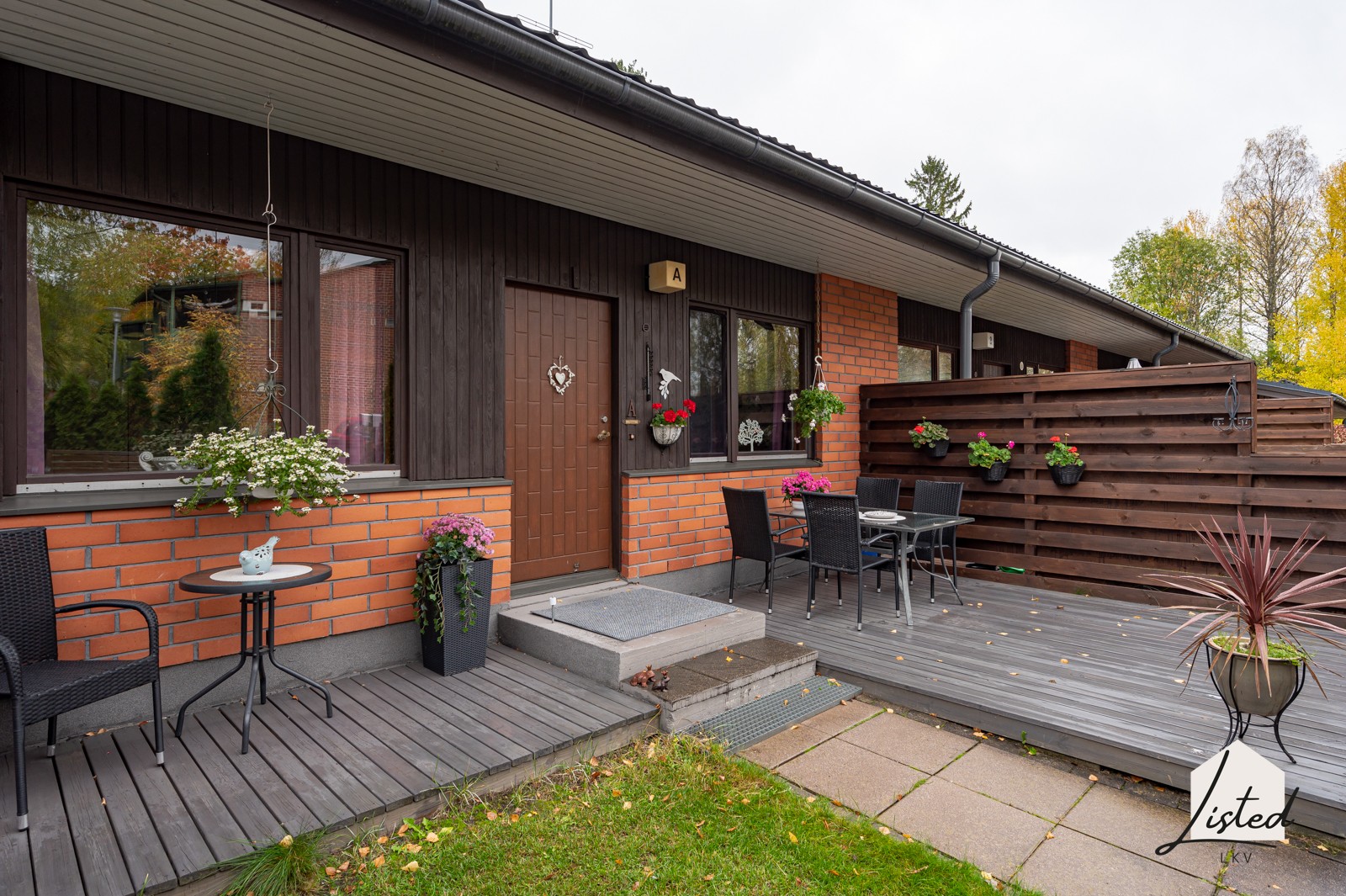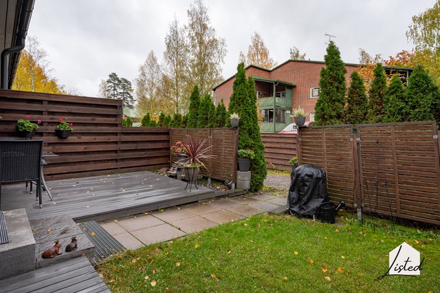- Suojaisat piha-alueet (etu- ja takapiha). Pihalla istutuksia, pensaita ja terassi.