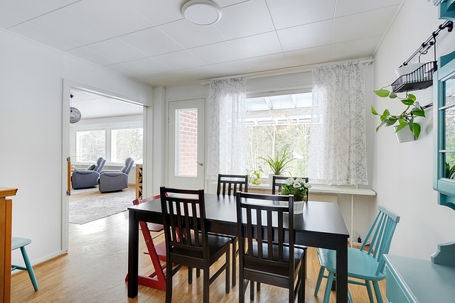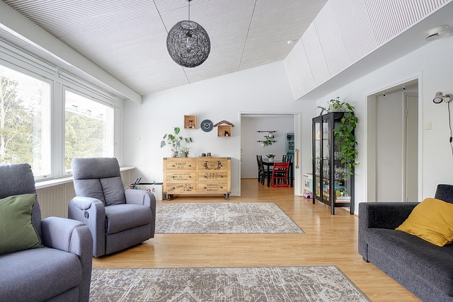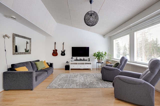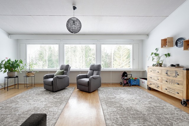 Olohuoneessa isot ikkunat ja korkea huonekorkeus.