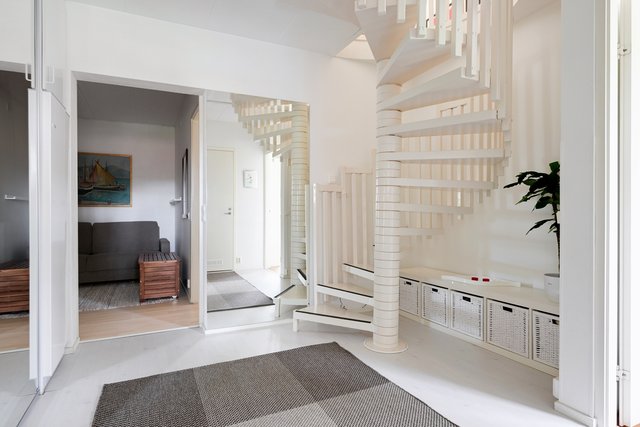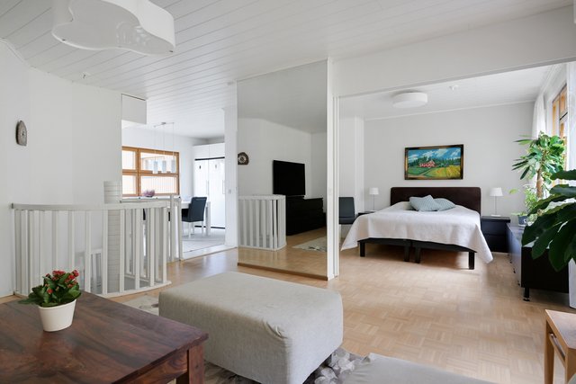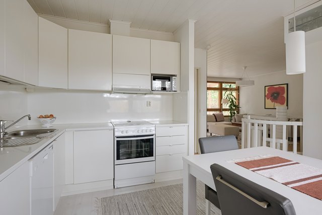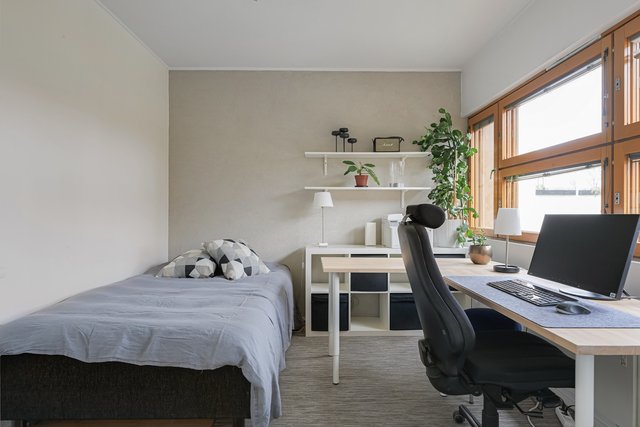 Asunnon sydän on avara olohuone, josta on käynti etelä-länsisuuntaiselle terassille ja vehreälle pihalle – täydellinen paikka nauttia kesäpäivistä. Keittiössä on kaikki tarpeellinen arjen sujuvuuteen, ja ruokailutila yhdistyy saumattomasti olohuoneeseen. Yläkerran kaksi makuuhuonetta tarjoavat runsaasti tilaa perheen tarpeisiin.