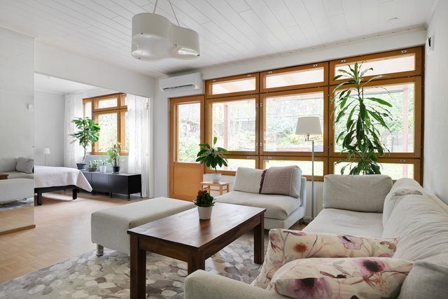 - Pinta-ala 86 + 42 m2 yhtiöjärjestyksen mukaan. 86 m2 huoneistoalaa ja 42 m2 muut tilat, kuten takkahuone ja askarteluhuone.