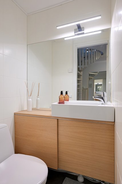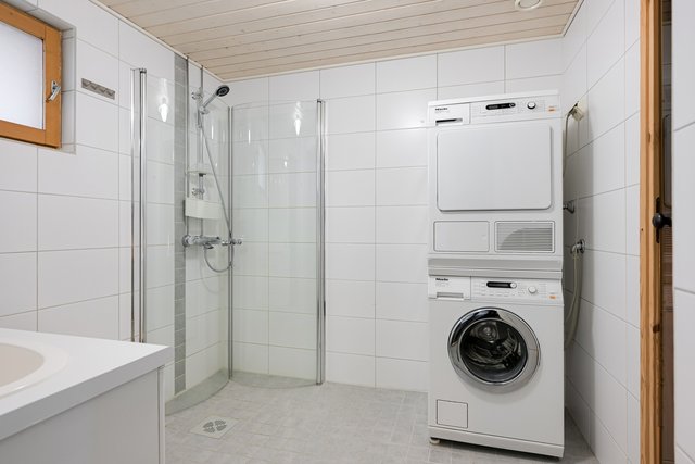- Suihku, suihkukaappi, pesukoneliitäntä, lattialämmitys, peilikaappi, pesuallas, ja allaskaappi