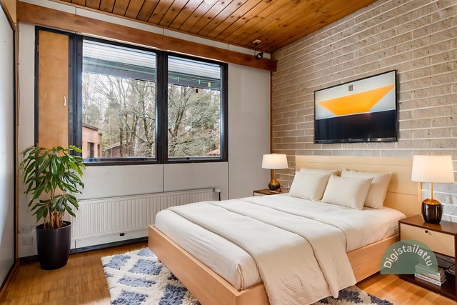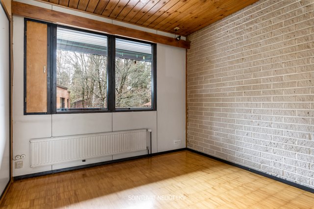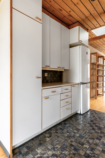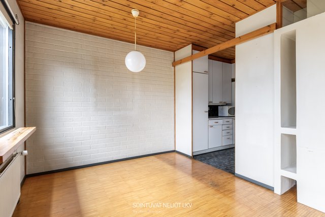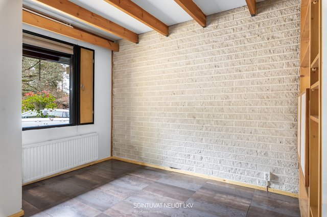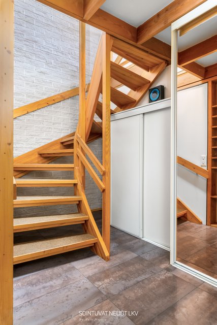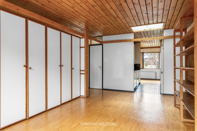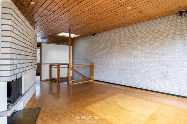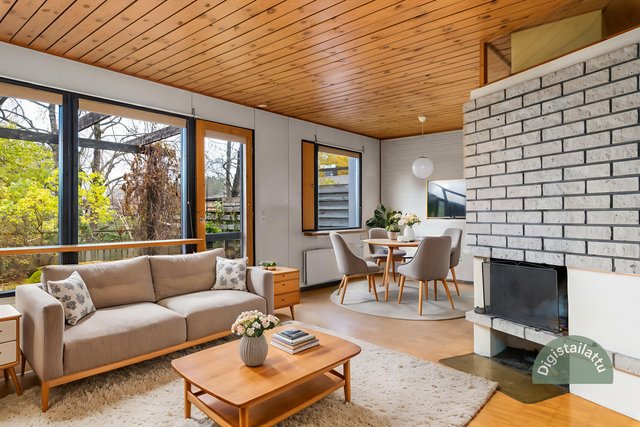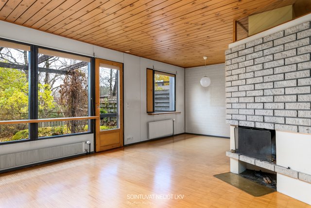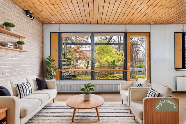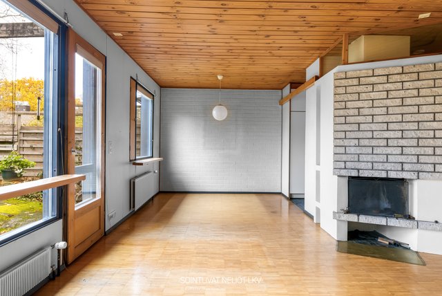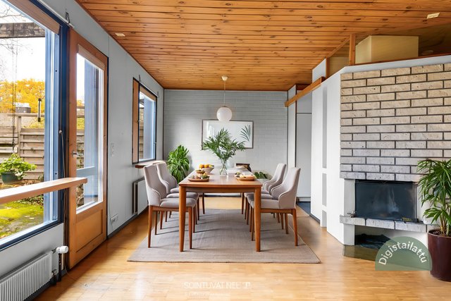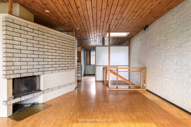 Asunnon keskiössä on kodikas ja avara olohuone, jonka viihtyvyyden kruunaa tunnelmallinen takka. Tilaan yhdistyy saumattomasti ruokailutila keittiöineen, josta avautuu olohuoneen tavoin viehättävät näkymät omalle suojaisalle piha-alueelle. Huoneisto on sekä pintamateriaaleiltaan että tilaratkaisuiltaan yksilöllinen, sillä asunnon alkuperäinen omistaja oli halunnut suunnitella itselleen ateljeemaisen kodin. Yläkerrassa on myös parveke sekä kodin toinen WC.