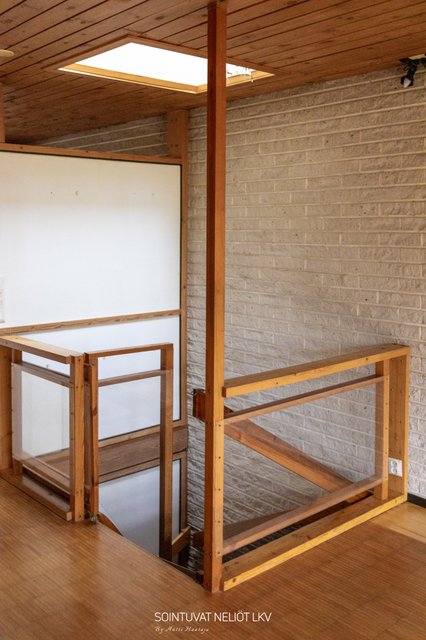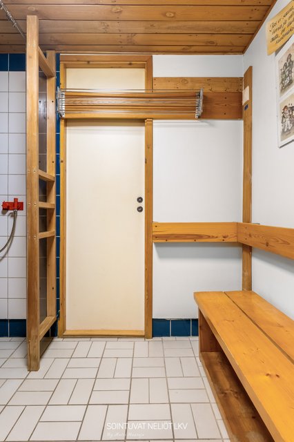Asunnon alakerta käsittää työhuoneen ja aulatilan ohella saunaosaston, joka odottaa niin ikään pintojen päivittämistä nykyaikaan.