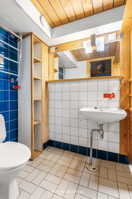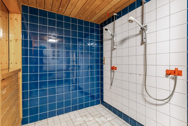 - Pesuallas, wc-istuin, vesikiertoinen pyyhekuivain, peili, suihku (2 kpl), pesukoneliitäntä, ja lattialämmitys (vesikiertoinen)