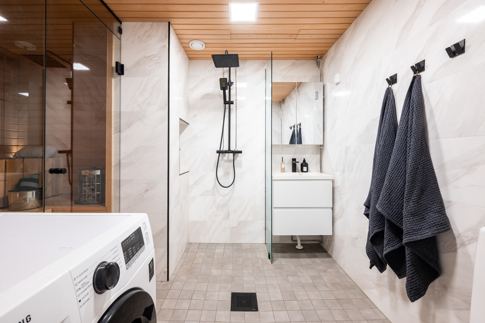 - Suihku, suihkuseinä, pesukoneliitäntä, lattialämmitys, peilikaappi, pesuallas, allaskaappi, ja wc-istuin