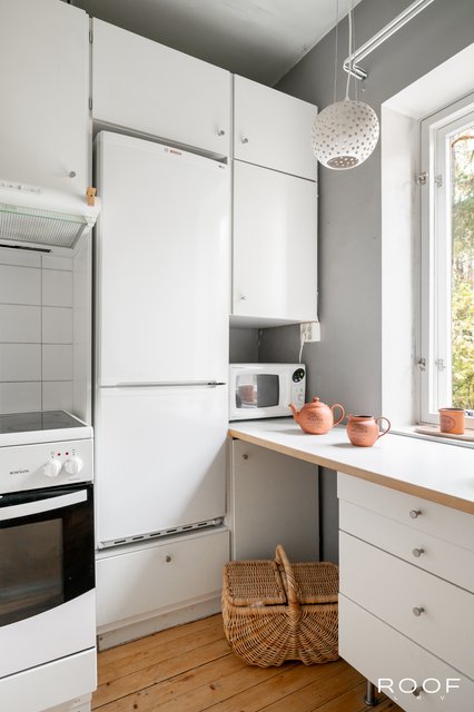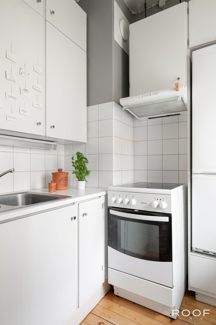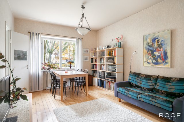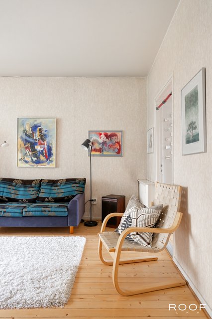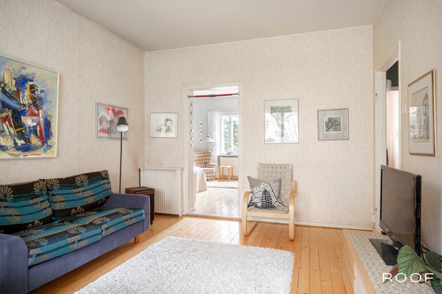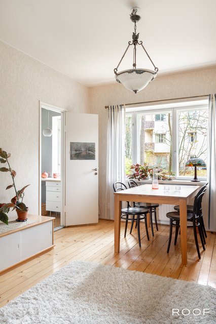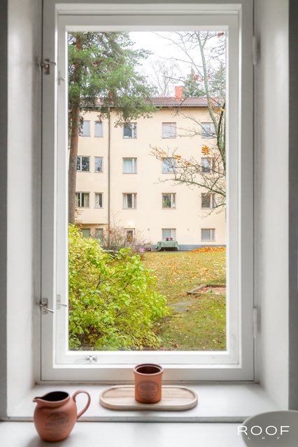 Valoisa olohuone tarjoaa hyvin tilaa sekä oleskeluun että ruokaryhmälle. Ikkunallinen keittiö saa luonnetta vanhoista kaapistoista ja kylpyhuone on uusittu perinteisen putkiremontin yhteydessä — tilaa on myös pyykinpesukoneelle. Asunnossa on kaunis lakattu puulattia, pois lukien kylpyhuone, mikä luo asuntoon lämpimän ja yhtenäisen ilmeen.
