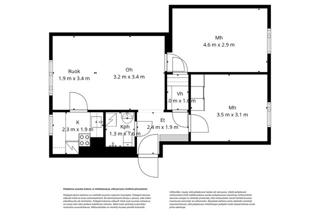 - Kohteen markkinoinnissa käytetään mittatiedoilla varustettua pohjapiirrosta. Pohjapiirroksen tarkoitus on helpottaa ostajan ostopäätöstä ja selvittää asunnon nykyinen huonejako. Lukija on tietoinen, että pohjakuva on suuntaa antava, ei mittakaavassa, eikä perustu virallisiin piirustuksiin. Välitysliike, myyjä, eikä pohjakuvan laatija ole vastuussa, mikäli pohjakuvan mittasuhteet eivät todellisuudessa vastaa pohjakuvassa mainittuja mittasuhteita. Lukijan on tärkeää ymmärtää, että mittasuhteet voivat heittää kuvassa mainitusta enemmän tai vähemmän. Myytävän kohteen pinta-alatiedot selviävät myyntiesitteestä, eikä pohjakuvan mittatietojen pohjalta voida laskea/olettaa muita pinta-alatietoja.