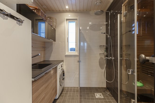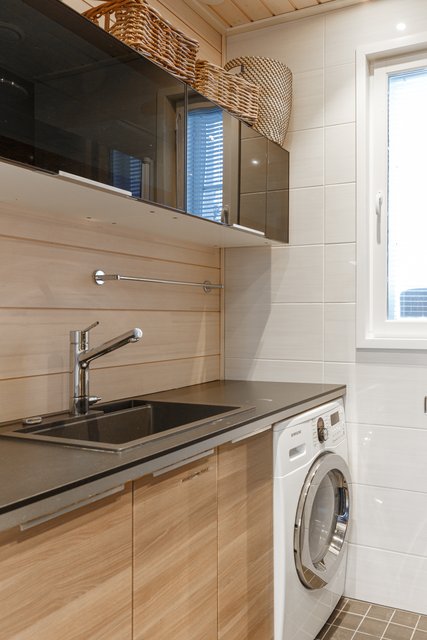 - Pesukoneliitäntä, lattialämmitys, pyykkikaapit, pöytätaso, pesukone kuivaustoiminnalla, ja pesukone