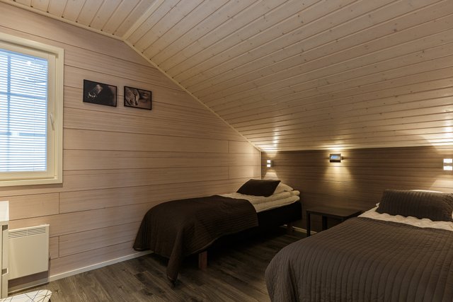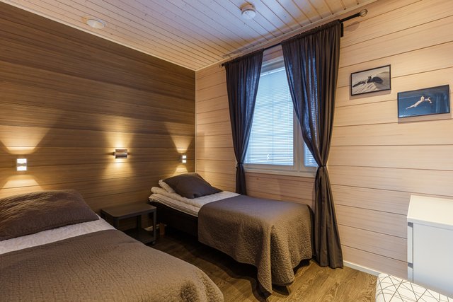 Huvila pitää sisällään yhteensä kahdeksan makuupaikkaa, yksi kahden hengen makuuhuone sijaitsee alakerrassa ja yksi kahden hengen ja yksi neljän hengen suuri makuuhuone ovat yläkerrassa. Molemmista kerroksista löytyy oma erillinen wc. Alakerrassa on myös tyylikäs kylpy/kodinhoitohuone ja sauna. Korkean ja avoimen olohuoneen yhteydessä on käynti suurelle katetulle terassialueelle ja patiolle, joka on ilta-auringon suuntaan. Piha-alueet ovat kivetetyt ja helppohoitoiset, pihapiiri, valli kiveykset ja istutusaltaat joita koristaa havupuut sekä kartiotuijjat muodostavat helppohoitoisen edustavan kokonaisuuden.