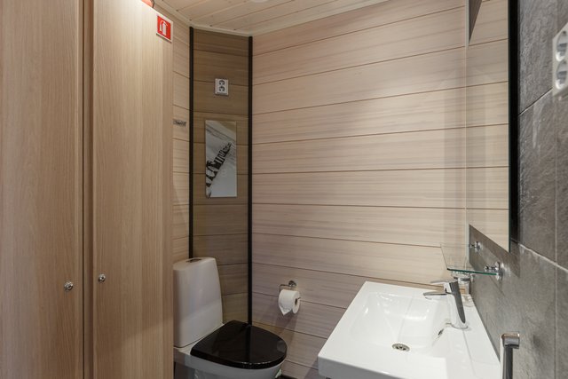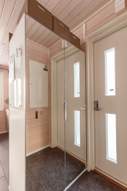 - Suihku, suihkuseinä, pesukoneliitäntä, lattialämmitys, pesuallas, ja allaskaappi