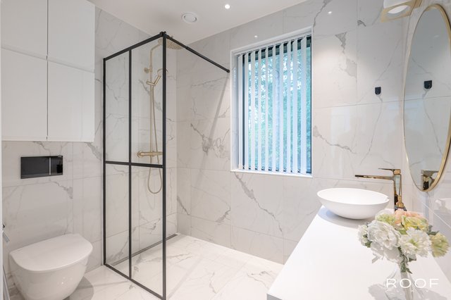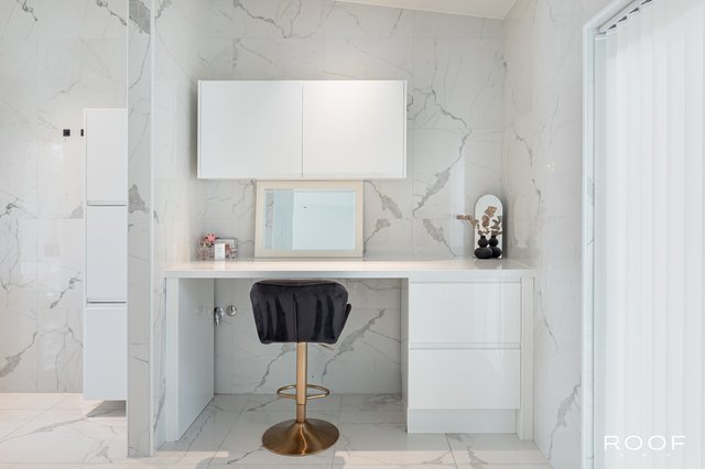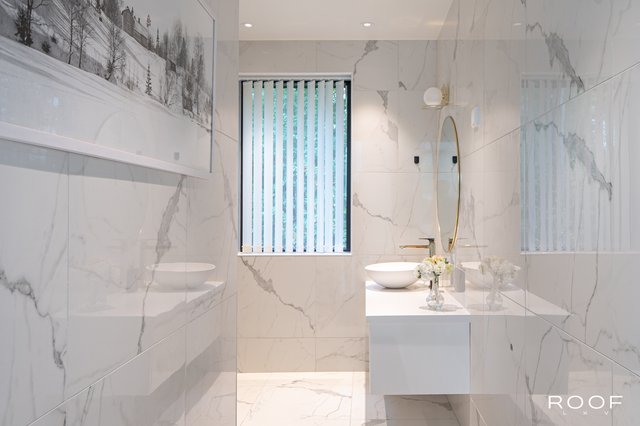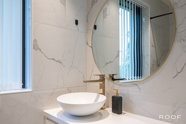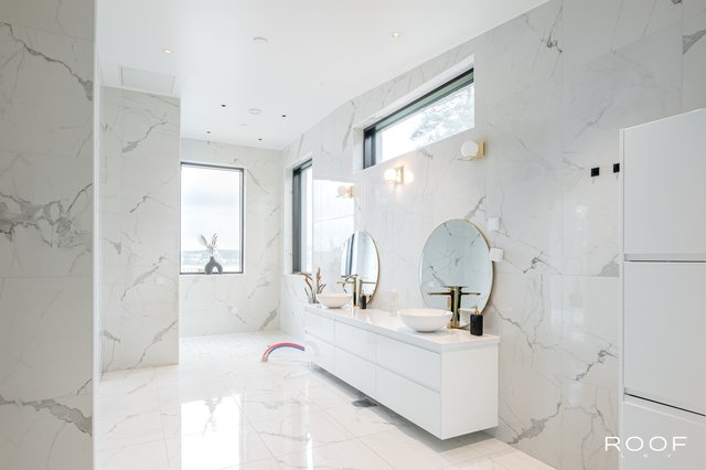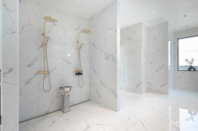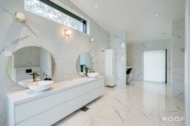 - Toimivia kylpyhuoneita on kaksi ja ne sijaitsevat sisääntulo-, sekä toisessa kerroksessa. Toisen kerroksen kylpyhuone on erittäin avara, jossa kaksi suihkua, kaksi allasta, allaskaapit, peilit, kaapisto, wc-istuin, bidee sekä varaus kylpyammeelle. Sisääntulokerroksen kylpyhuone sijaitsee kätevästi aulan läheisyydessä. Allas, allaskaappi, seinäkaappi, peili, bidee, wc-istuin, lasinen suihkuseinä. Lattiat sekä seinät ovat laatoitetut marmorikuviollisella laatalla. Tämän lisäksi keskeneräinen alakerran suuri Spa-osasto on. Suunnitelmat ovat valmiit ja kalusteet miltei valmiit ja kohteessa.