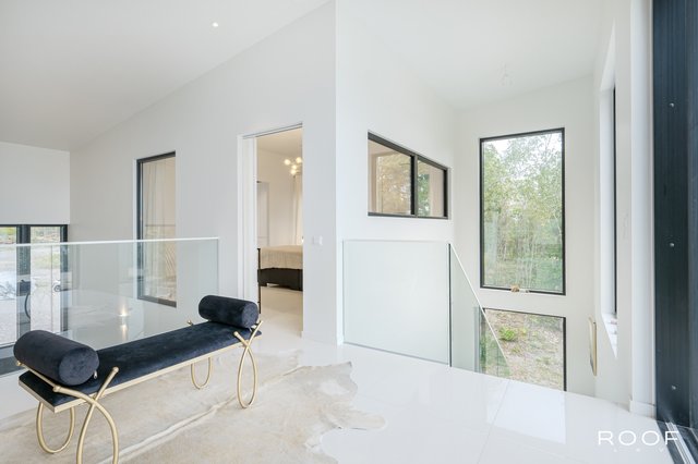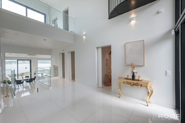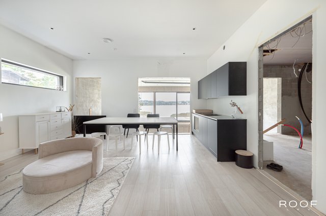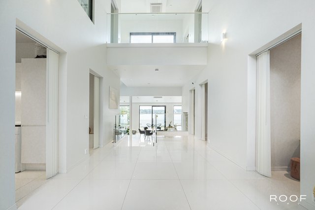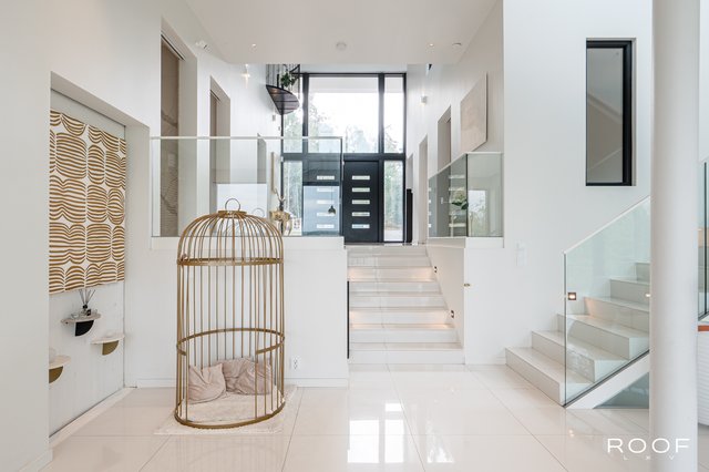 Talon pääsisäänkäynti avautuu valoisaan aulaan, josta katse kiinnittyy vaikuttavaan huonekorkeuteen ja suurista ikkunoista tulvivaan luonnonvaloon. Olohuone sijaitsee muutaman askelman alempana ja yhdistyy saumattomasti moderniin avokeittiöön – täydellinen tila yhdessäoloon ja rentoutumiseen. Olohuoneesta on käynti terassiparvekkeelle, josta avautuu upeat merinäkymät.