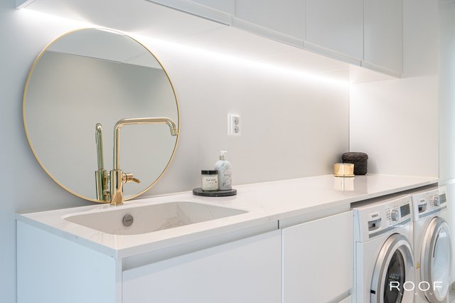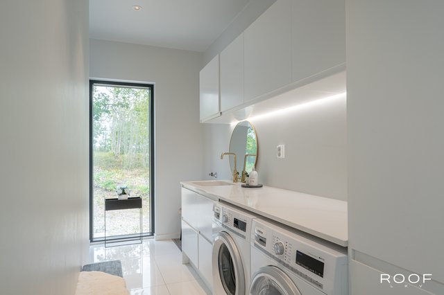- Kodinhoitohuone on kätevästi arkieteisen yhteydessä. Kodinhoitohuoneesta on oma uloskäynti. Kalusteet ovat vaaleansävyisiä ja laskutilaa on runsaasti. Allas, lattiakaivo, kura-allas, pesukoneliitäntä, kuivauskaappi, maisemaikkuna. Lattia vaaleaa laattaa, seinät ovat maalatut.
