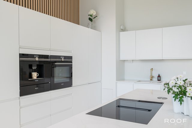 - Upea vaaleansävyinen A la Carte-avokeittiö saarekkeella. Keittiö on toimiva ja siellä hyvin säilytys- sekä laskutilaa. Uuni x2, kahvikone, induktiotaso liesituulettimella, astianpesukone, kaksi jääkaappipakastinta, mikro, lämpölaatikko. Keittiössä suuri maisemaikkuna. Lattia laattaa, seinät ovat maalatut. Pystypaneloitu akustiikkaseinä päätykaapiston takana.