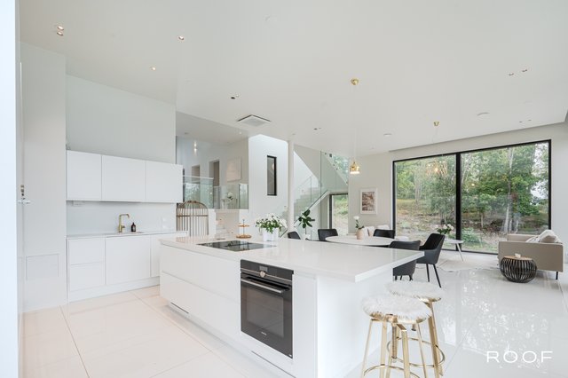 Modernissa ja tilavassa keittiössä on käytännöllinen saareke, jossa mahtuu nauttimaan vaikka aamupala. Koneet on integroitu tyylikkäisiin A la Carte -keittiökalusteisiin, ja ruokailutilalle on varattu reilusti tilaa saarekkeen edustalta. Täällä on ilo kokata ja kestitä!