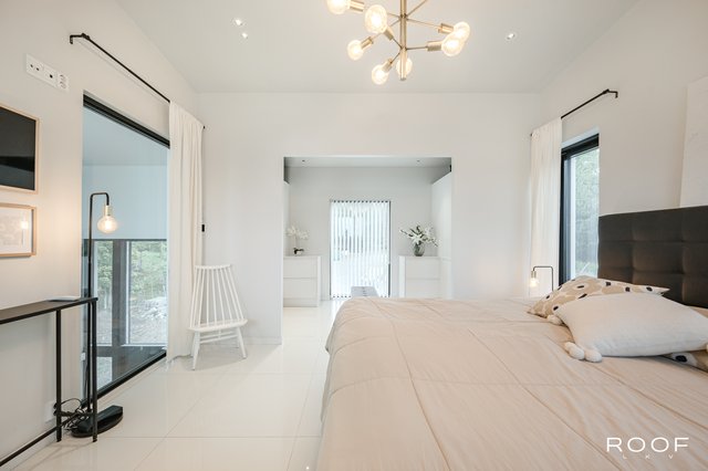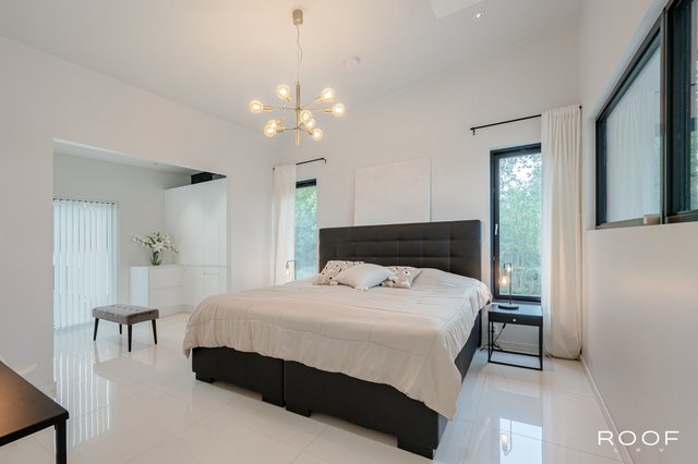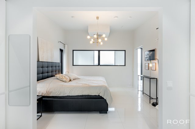 - Sisääntulokerroksessa kolme makuuhuonetta, joista yksi toimii tällä hetkellä kotikonttorina. Toisen kerroksen master bedroom on erittäin avara ja valoisa, jossa tilava vaatehuone. Huoneessa maisemaikkuna merelle. Lattia vaaleaa laattaa, seinät ovat maalatut.