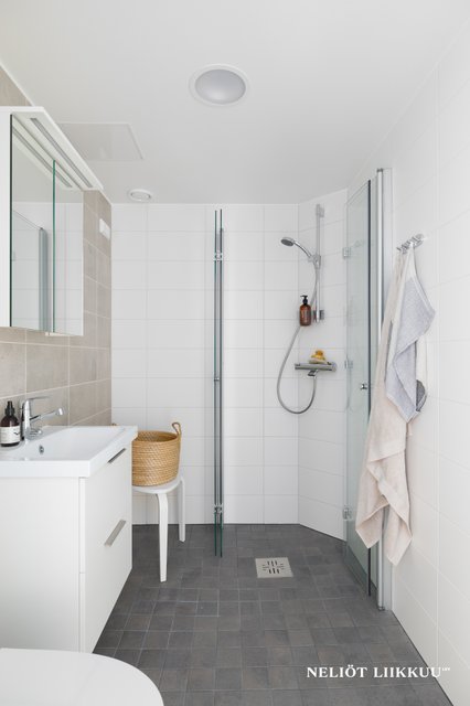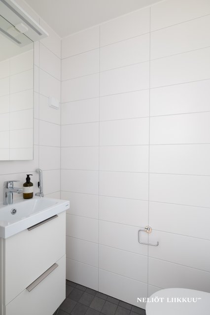 - WC-istuin, suihku, suihkuseinä, lattialämmitys, pesukoneliitäntä, peilikaappi, allaskaappi, pesuallas, ja bidee-suihku